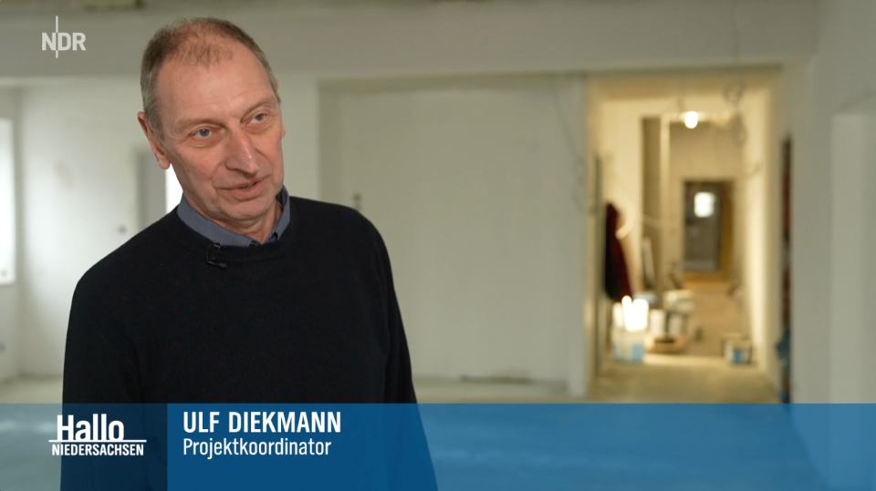 Angekommen beim Alten Haarmeyer konnte vor allem Ulf Dieckmann ausführlich über Gebäude und Konzept berichten. Das NDR Team wurde durch das gesamte Gebäude geführt und das Konzept des Dorftreffs wurde anhand der Räumlichkeiten erläutert. Vorab war natürlich telefonisch schon vieles besprochen worden, vor Ort beeindruckte aber die schiere Größe der Immobilie, das große Engagement von Ehrenamtlichen und die gut durchdachte, flexible Nutzbarkeit der Räumlichkeiten das dreiköpfige Team.