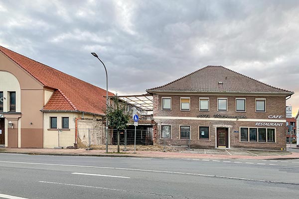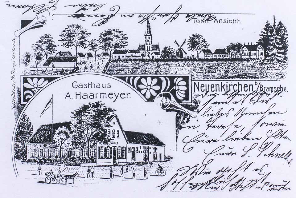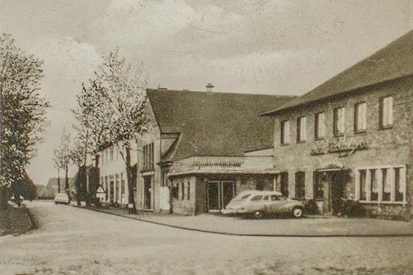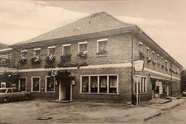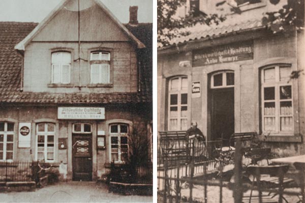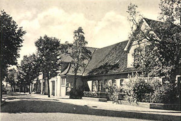 Das ursprüngliche Gasthaus (damals der Familie Gerken – mehr dazu hier) bestand aus einer Schankwirtschaft und einem Laden (Zugang rechts, Alte Poststraße). Im hinteren Teil befand sich die Bäckerei sowie Stallungen. Im Pferdestall wurden während des Kirchgangs die Pferde der Limberger und Westerlager Bauern, die mit der Kutsche zur Kirche gefahren waren, ausgespannt und untergestellt.