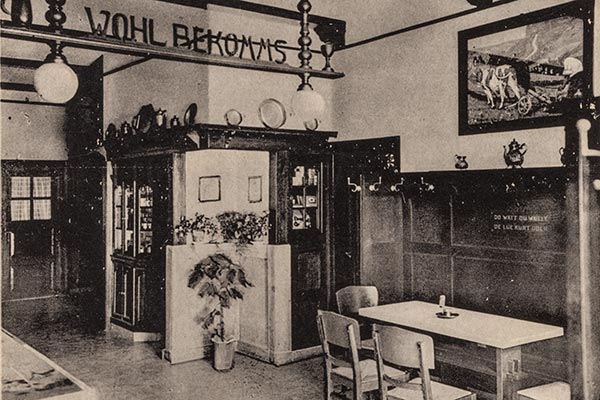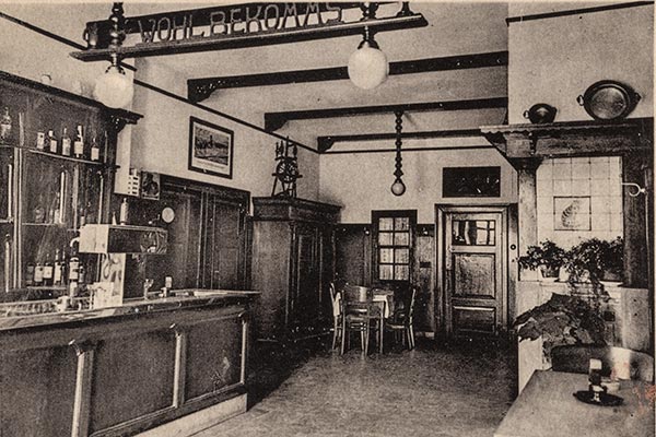 Auch im Inneren des alten Haarmeyer hat sich über die Jahre immer wieder etwas getan. Hier der Innenraum der Kneipe bis zum Neubau in den 50er Jahren. Der Spruch »Do watt du wusst, de Lüe kürt doch!« stand schon damals in der Nische. Passend ist er noch heute.