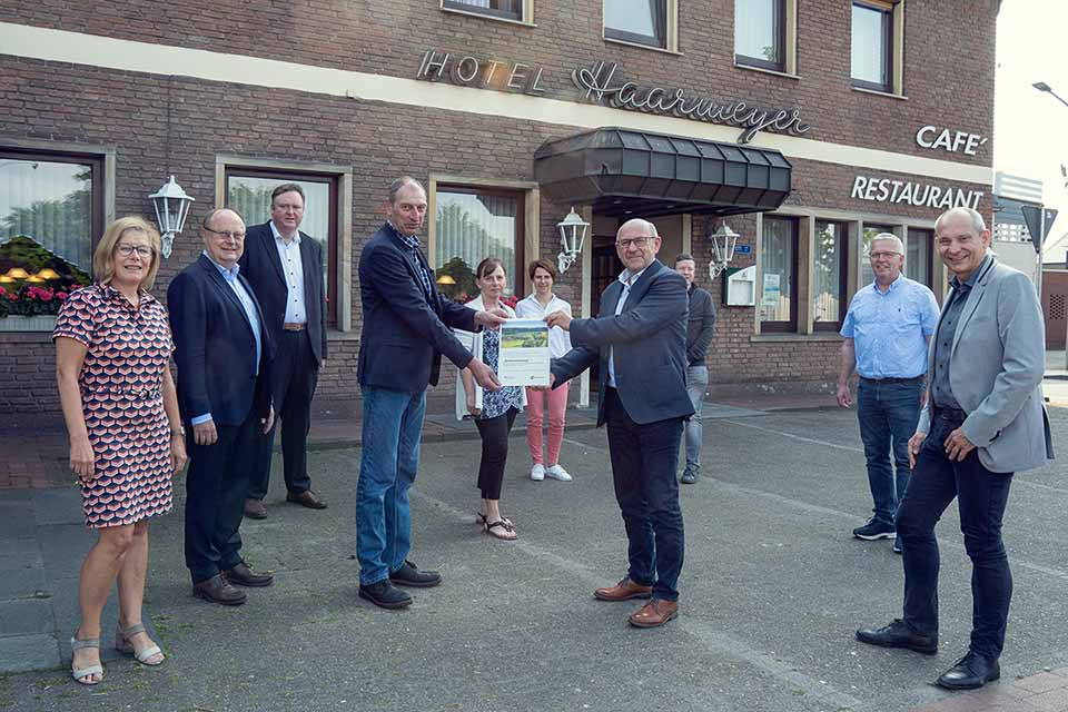 Im Rahmen der Sozialen Dorfentwicklung »Dorfregion Neuenkirchen – Merzen« ist der Dorftreff Beim Alten Haarmeyer mit seinen verschiedenen Nutzungsbereichen inzwischen zu einem Leitprojekt geworden. Das Bild zeigt Herrn Wencker und Herrn Bendig vom Amt für Regionale Landesentwicklung bei der Überreichung der Förderbescheide für den Dorftreff. Umrahmt von Vertretern der Gesellschafter und Aufsichtsratsmitgliedern. Das Amt für Regionale Landesentwicklung berät auch bei der Einhaltung der Vergabevorschriften und der ortstypischen Gestaltung des Gebäudes.